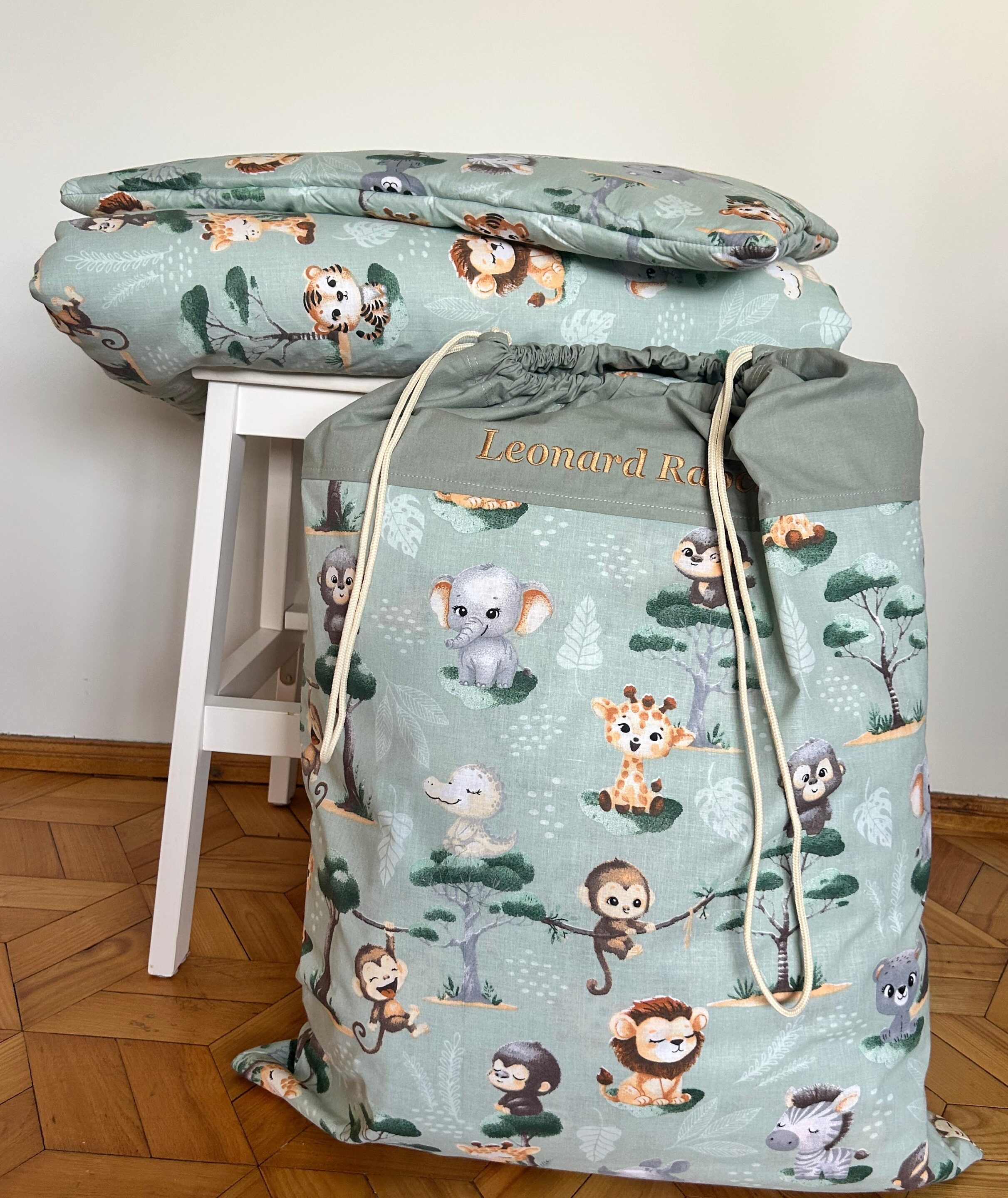 • Worek z personalizacją: idealny do przechowywania pościeli w żłobku lub przedszkolu. Wykonany z bawełny w różne, urocze wzory dziecięce. Posiada sznurek bawełniany umożliwiającą ściągnięcie woreczka od góry.