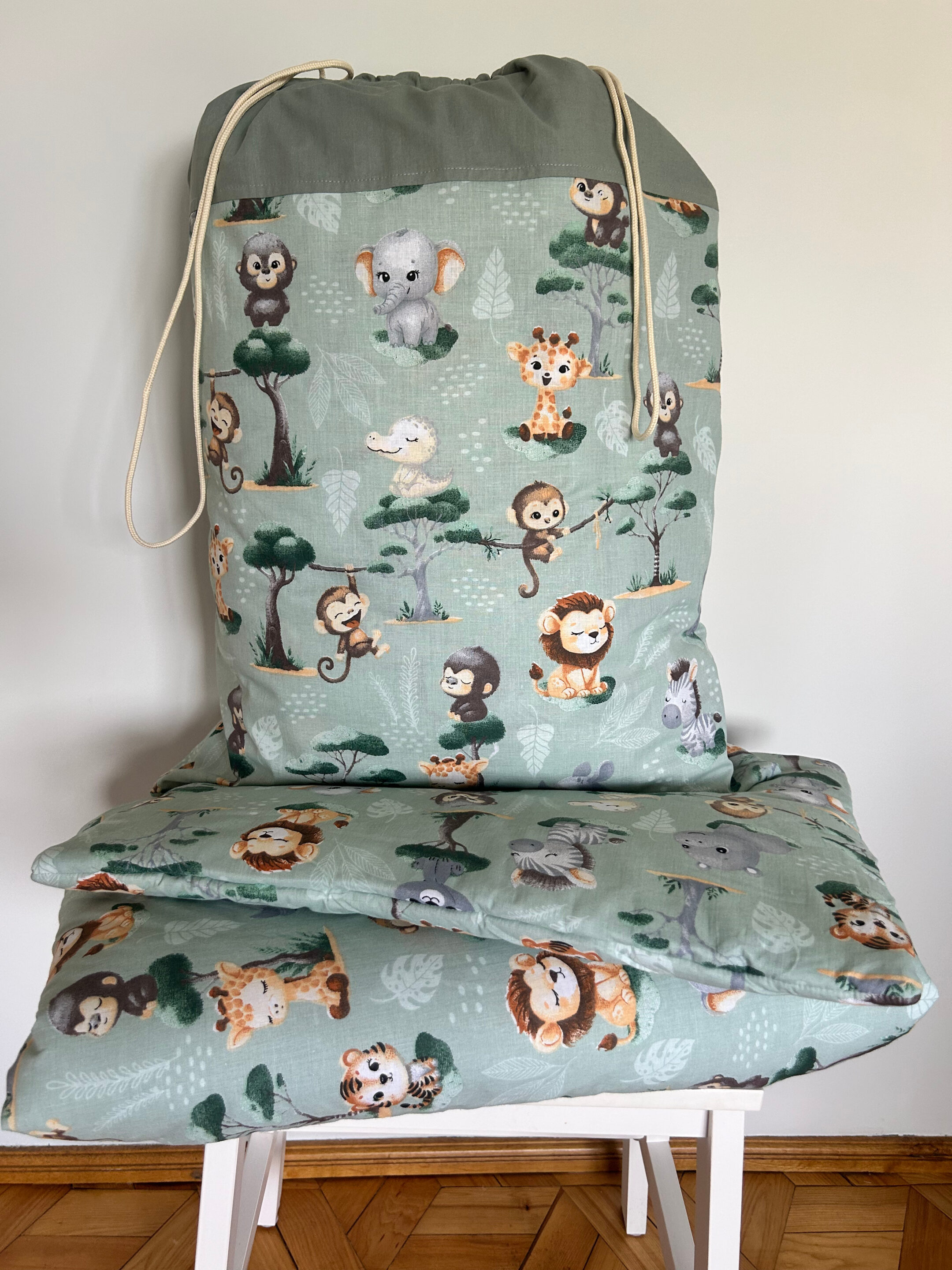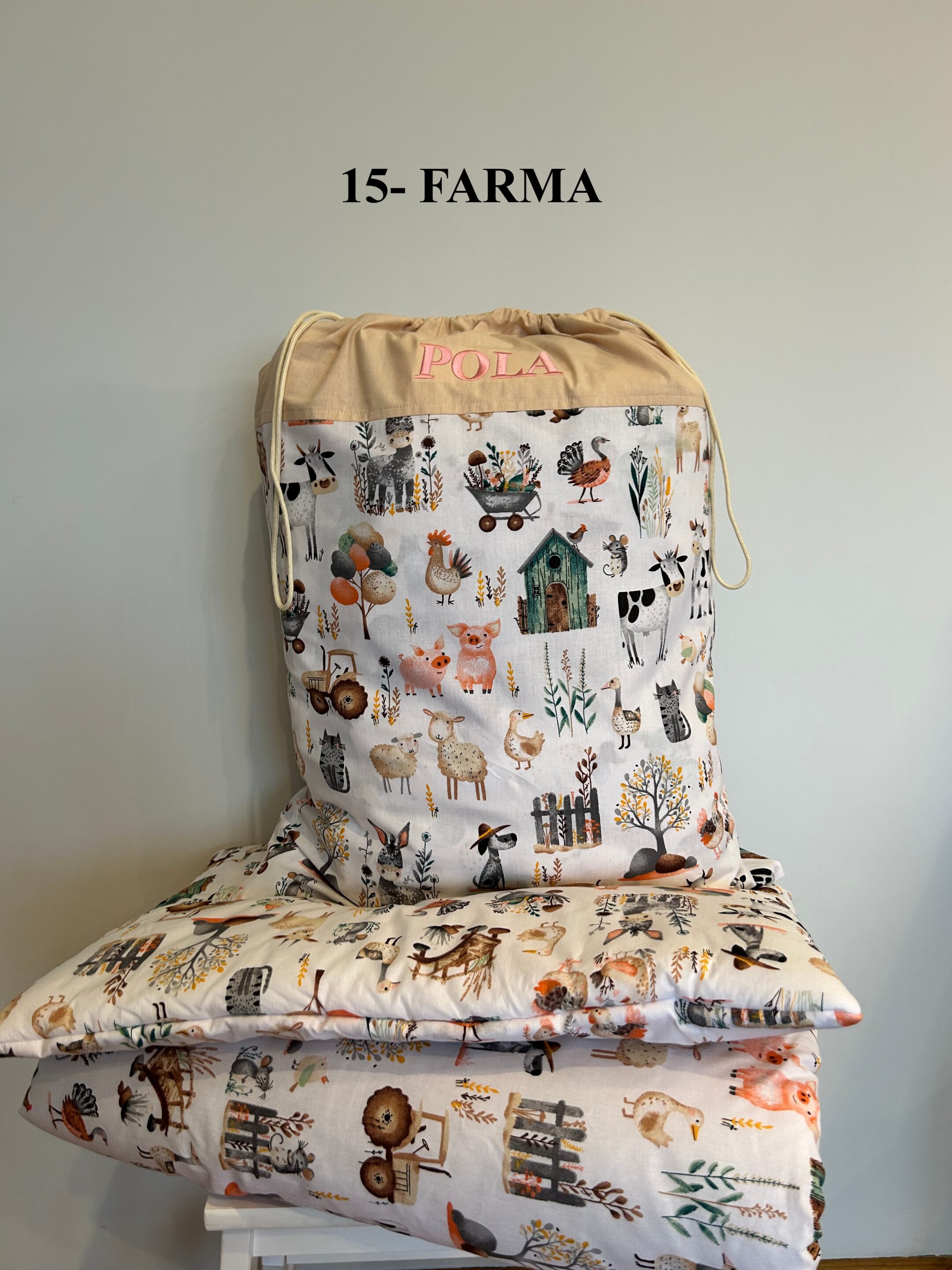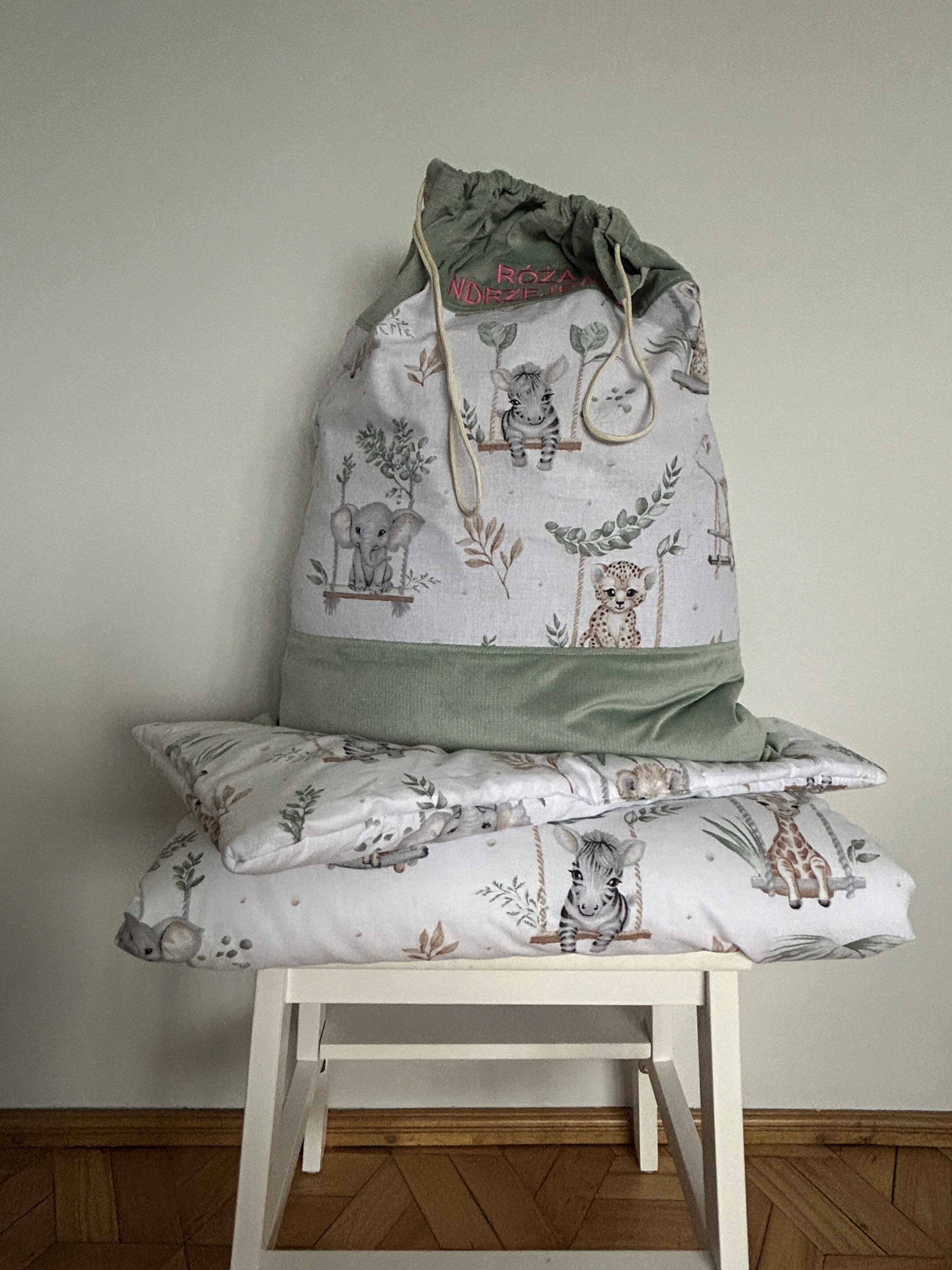 Kołderka 220cm x75cm, poduszeczka 40cm x 60cm oraz duży pojemny worek. Wyprawkę personalizujemy GRATIS! materiał : bawełna 100%. Dostępne wzory widoczne w galerii.