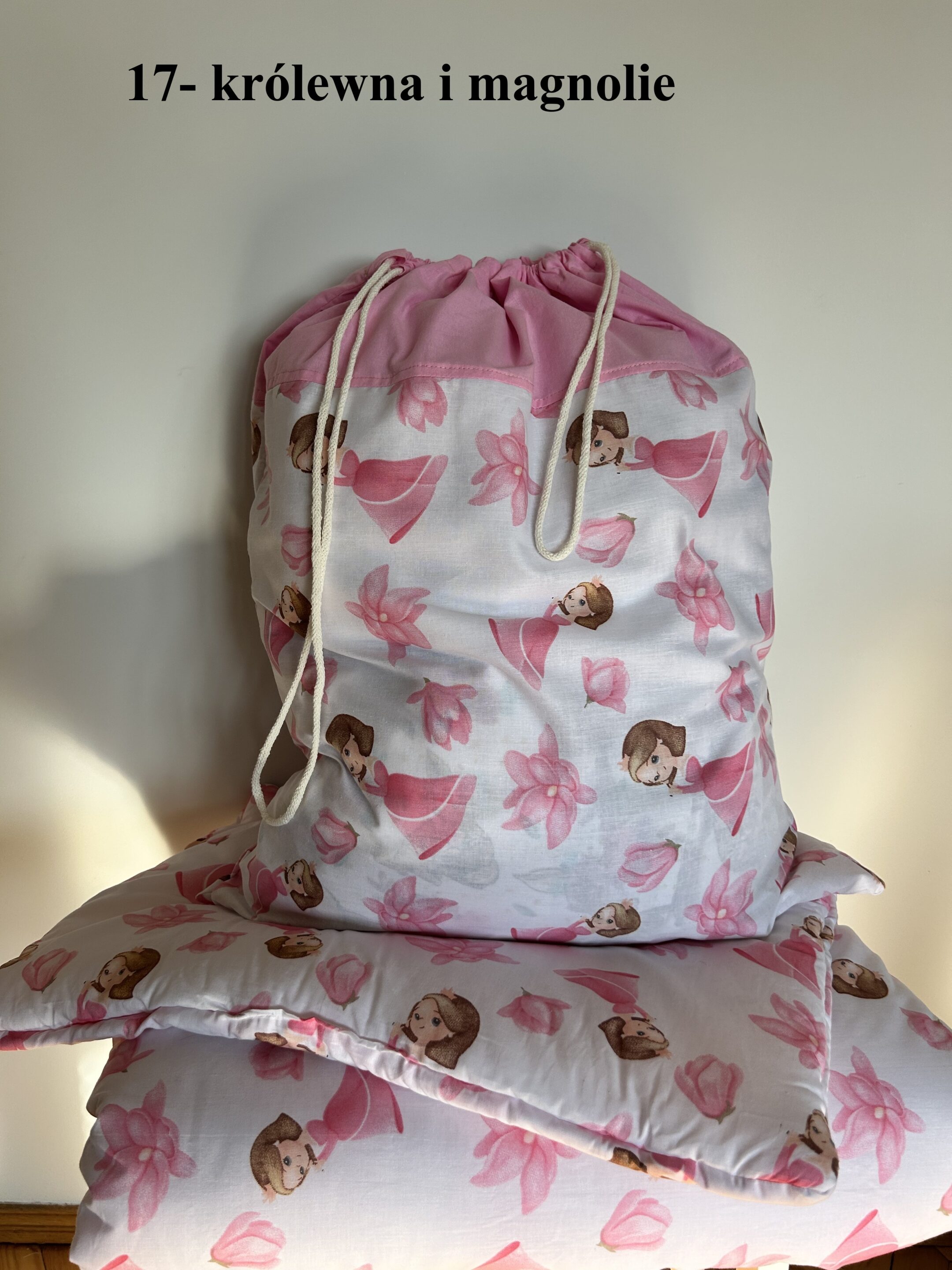 - Worek z personalizacją: idealny do przechowywania pościeli w żłobku lub przedszkolu. Wykonany z bawełny w różne, urocze wzory dziecięce. Posiada sznurek bawełniany umożliwiającą ściągnięcie woreczka od góry.